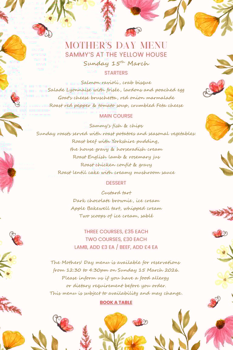 Join us on Mothers Day and enjoy a relaxing Sunday afternoon with your family and Sammy's excellent two or three course Sunday lunch menu.